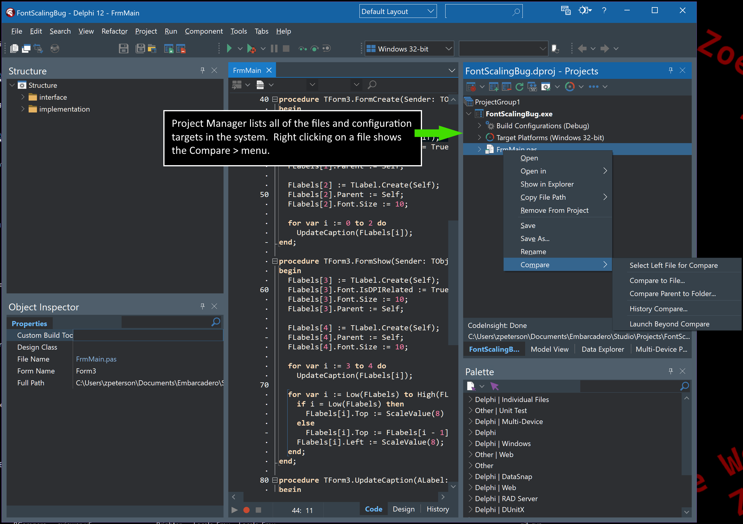 Since the first version, Scooter Software decided to develop Beyond Compare in Delphi and started the project in 1996 with the first Delphi version based on the VCL. Based on this close technical connection, a Delphi IDE integration was originally written by an external developer. Scooter Software purchased this solution and has been offering direct integration of Beyond Compare into Delphi and C++Builder since 2010. The slightly reduced Lite version can be launched directly from any RAD Studio/Delphi/C++Builder IDE. In addition, it is possible to use the tool via the command line and in the build process. With each release of a new Delphi version, the developers keep the product up to date.