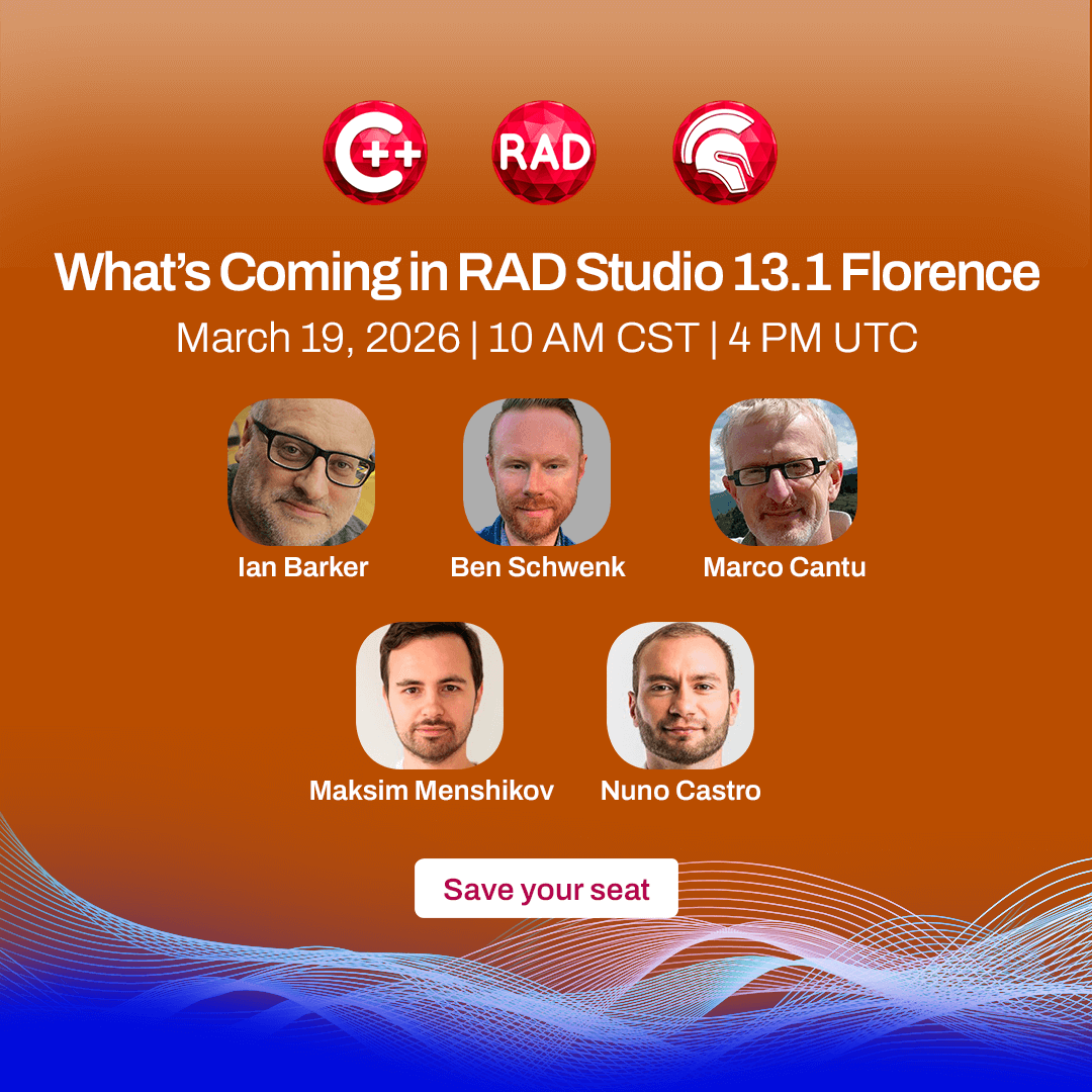 RAD Studio 13.1 Florence is the next release of your favorite way to develop applications that run on Windows, macOS, Linux, iOS, and Android. Join us for this special sneak-peek webinar where we reveal some of what’s coming along with what we’ve been working on - including some very exciting news and a live Q & A!
