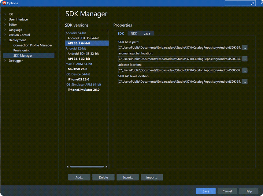 RAD Studio 13.1 adds support for Android API level 36.1, a mandatory requirement for publishing apps on the Google Play Store starting August 2026. The build system and platform jar files have been upgraded to support Android API level 36.1. The Application Uses Permissions options page now includes the new permissions for the latest API level, and the version of the JetPack Core library the FireMonkey framework depends on for Android has been upgraded. RAD Studio also adds official support for iOS 26, and has increased the default value of the Minimum iOS version supported.