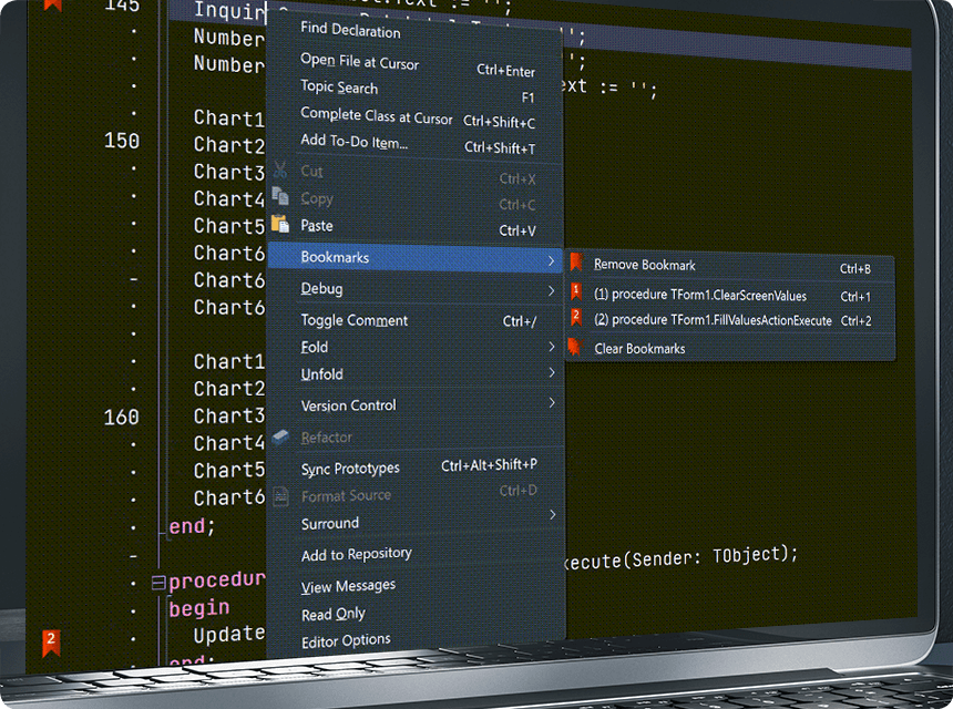 RAD Studio 13.1 fully integrates the Bookmarks Addon into the IDE. The Bookmarks plugin now fully replaces the corresponding IDE’s built-in bookmarks functionality. The extended Bookmarks feature adds several advanced capabilities, including automatic bookmark numbering, rapid keyboard-driven navigation, and a structured list of active bookmarks with exact code-line references. This enables developers to move more quickly through their application’s source code and quickly return to a previous section of their code.