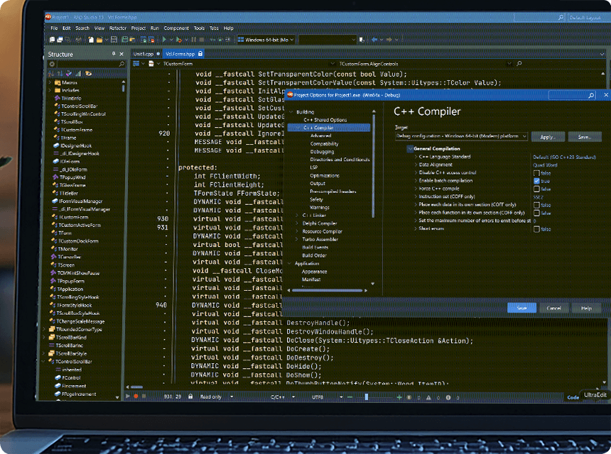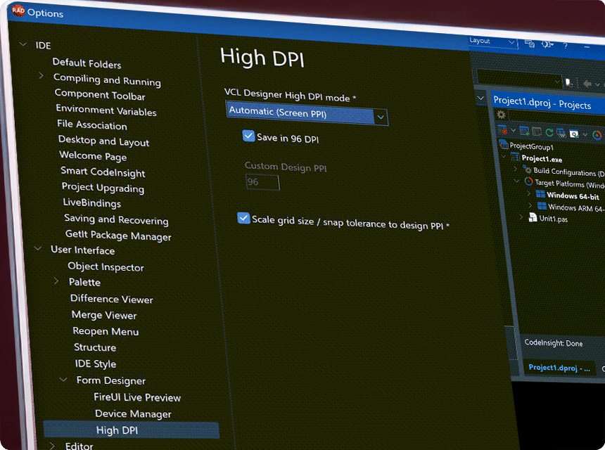 RAD Studio 13.1 delivers a major improvement to the HighDPI design experience. Forms can be saved at 96 DPI, useful for teams working on the same project across different resolutions and HighDPI IDE configurations. Product registration has been modernized: the License Manager application and the Product Registration dialog box have been improved, offering HighDPI support via the Per Monitor v2 configuration, updated fonts, and an overall UI cleanup. This release also includes several debugger quality improvements, with a particular focus on the 64-bit debuggers for Delphi and Modern C++.