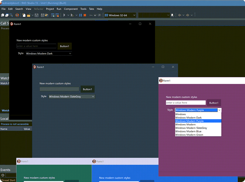 RAD Studio 13.1 Florence adds a family of 6 new Windows 11 specific VCL styles, which include different color tones. The list includes: Windows Modern, Windows Modern Dark, Windows Modern SlateGray, Windows Modern Green, Windows Modern Blue, and Windows Modern Purple. There is also a matching new version of the IDE styles, further aligning the RAD Studio IDE to the Windows 11 UI style. There is also support for rounded edges in many windows, an enhanced IDE search control and navigation toolbar.